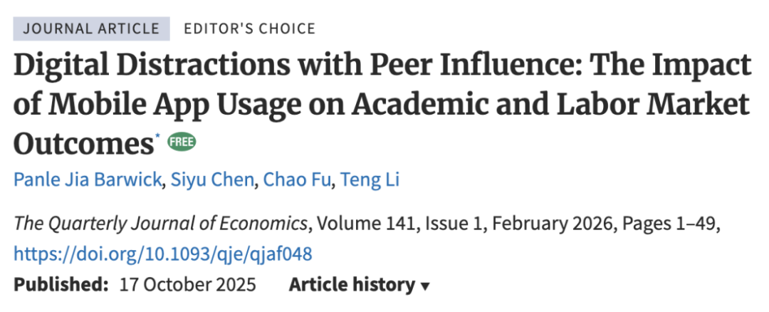 学生记者:您与合作者近期在Quarterly Journal of Economics上发表的关于手机App使用对学业与劳动力市场影响的论文,就获得了《经济学人》等国际媒体的关注。能否分享一下,在冲击顶刊的过程中,有哪些让您印象深刻的攻坚时刻?比如在数据获取、模型构建或同行评审阶段,您是如何突破瓶颈的?对于有志于学术研究的年轻学子,您认为作为一名科研工作者最需要具备哪些品质或能力?
