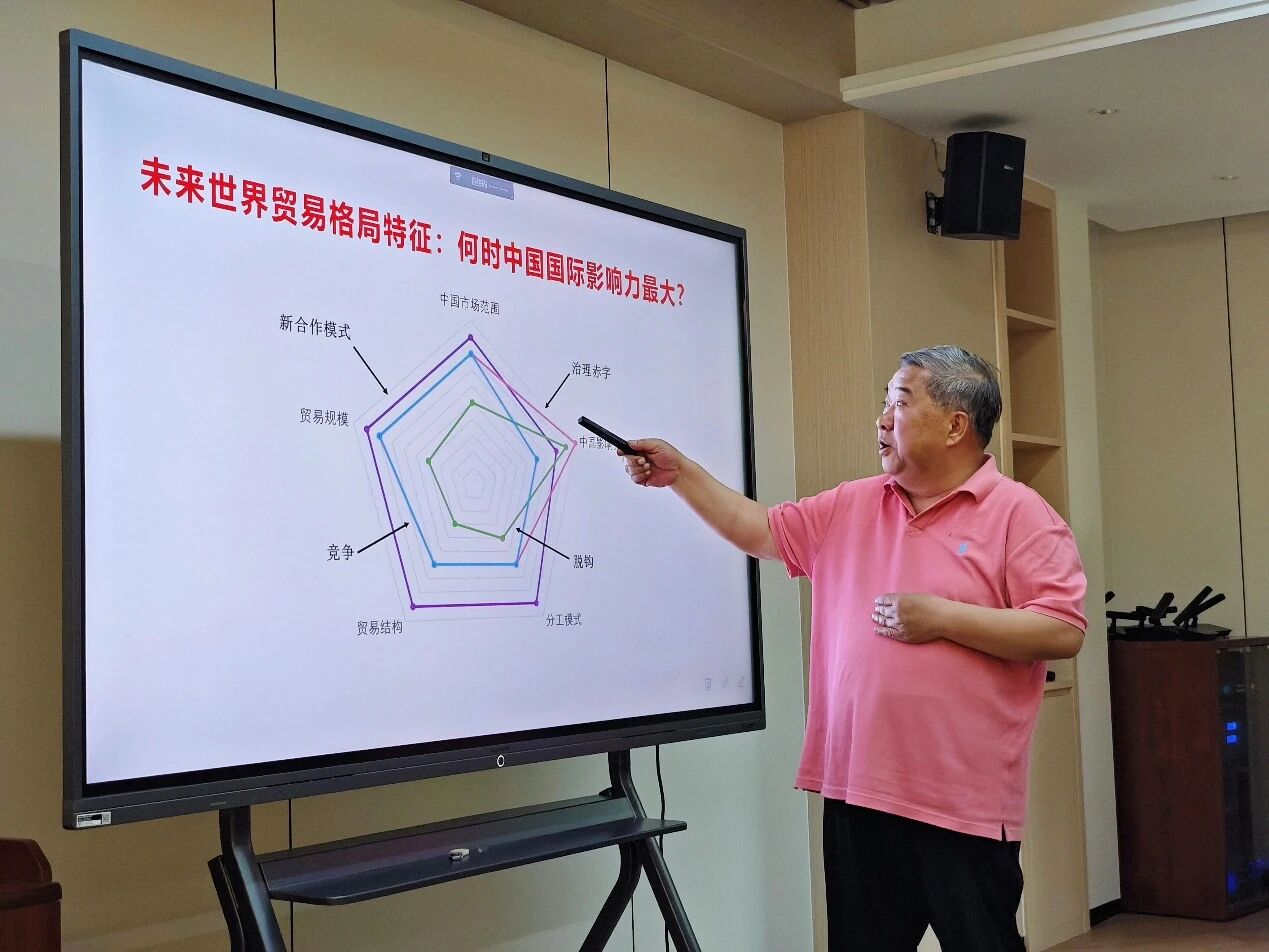 林桂军教授首先回顾了全球金融危机爆发后的一系列冲击事件,分析了这些事件对国际政治经济格局的影响。随后,围绕地缘政治、全球化和数字革命这三个驱动贸易格局变化的关键因素,采用立体坐标系的方式,创新性地勾勒出未来世界贸易格局可能出现的四种场景:脱钩、竞争、治理赤字与新合作模式。林教授逐一解析了各场景下贸易格局的基本特征:脱钩场景中,各国趋向保护主义政策,减少贸易往来,中国市场范围面临缩小压力;治理赤字场景下,全球经济继续增长但治理结构出现问题,中国将主动参与全球治理;新合作模式中,各国积极共建全球治理体系,中国市场范围扩大,影响力提升。最后,林教授通过雷达图清晰标示出上述四种场景下中国市场范围、贸易规模、贸易结构、分工模式及中国影响力的各项特征,并细致分析了中国市场范围与国际影响力的变化趋势。