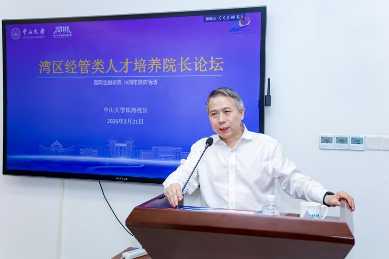 2026 年 3 月 21 日下午,中山大学国际金融学院 20 周年院庆活动—— 湾区经管类人才培养院长论坛,在珠海校区海琴 6 号 A426 会议室举行。来自北京大学、武汉大学、南开大学、上海财经大学、北京师范大学等十余所高校的经管学院院长、书记及专家学者齐聚一堂,共议经管类人才培养核心议题。